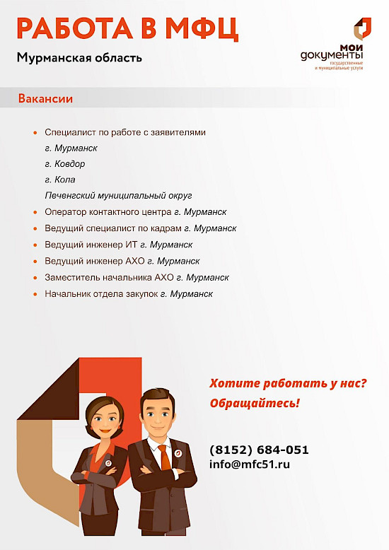 Уважаемые соискатели! Резюме просим направлять по электронной почте: info@mfc51.ru