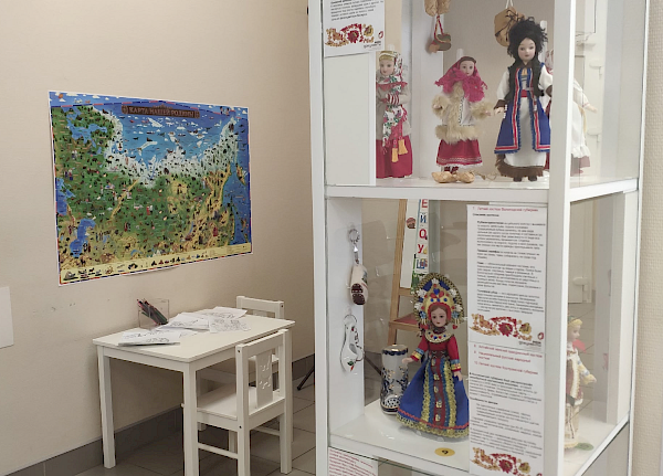 Для юных посетителей МФЦ также представлена большая наглядная карта с географией России и многонациональным культурным наследием страны, отображающая масштабы и разнообразие регионов, содержащая раскраски с традиционными нарядами народов России, указывющими на самобытные традиции.